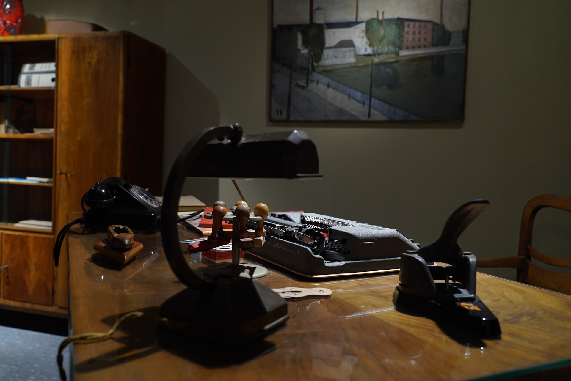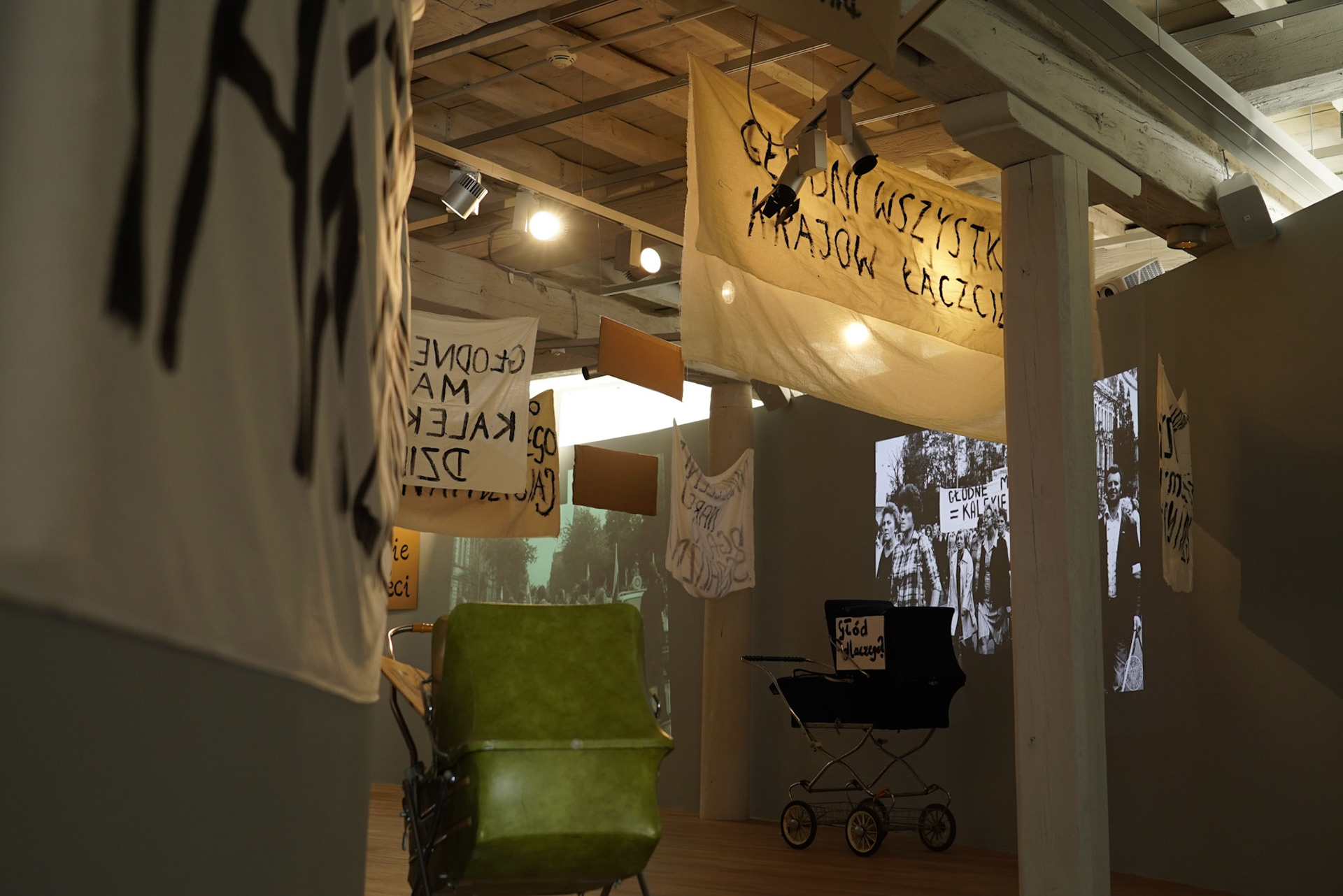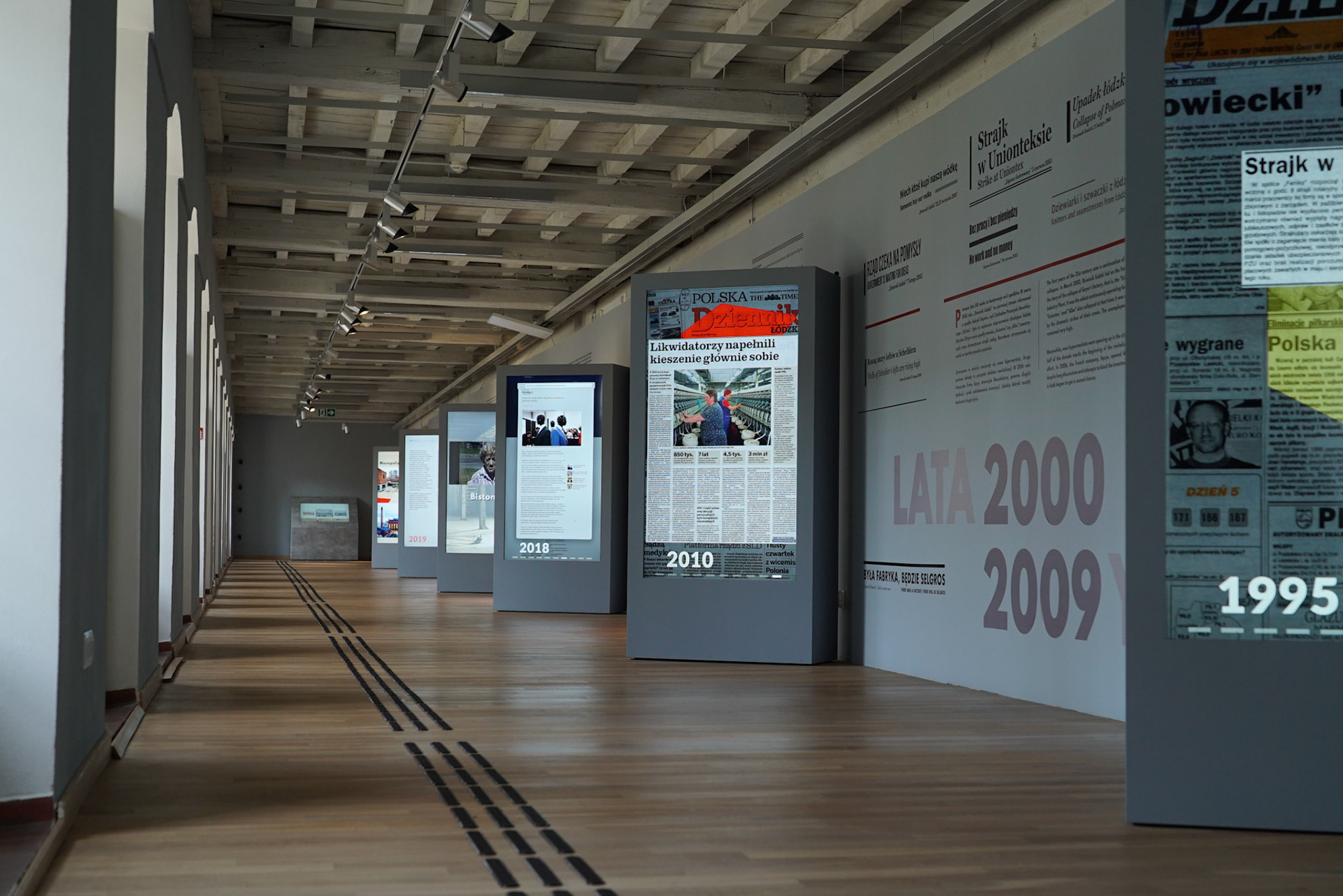 Pierwsze piętro wystawy zostało poświęcone rozwojowi miasta oraz funkcjonowaniu społeczeństwa między pracą, a odpoczynkiem. To również opowieść o walce kobiet o godniejsze warunki pracy. Gość zostaje zderzony z atmosferą strajku, jest świadkiem i uczestnikiem. Pierwsze piętro zamyka korytarz, w którym w formę city lightów zostały ubrane doniesienia prasowe na temat żywotu łódzkich fabryk.